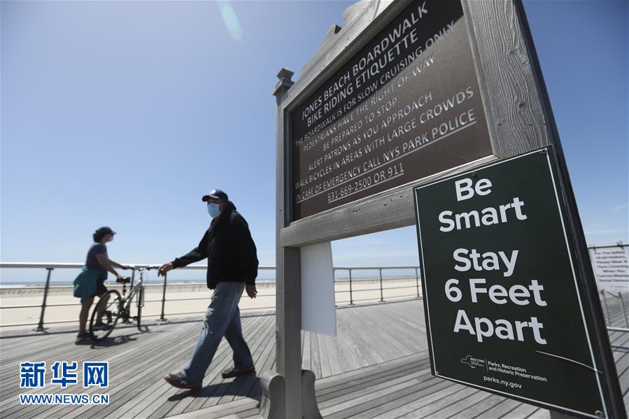 5月22日,在美国纽约州琼斯海滩,海滨栈道上挂着保持社交距离的提示。 当天,美国纽约州属海滩在阵亡将士纪念日假期到来之际开始对公众开放。开放期间,海滩采取限制客流、保持社交距离、增加消毒等多项措施,防止新冠病毒传播。 新华社记者 王迎 摄