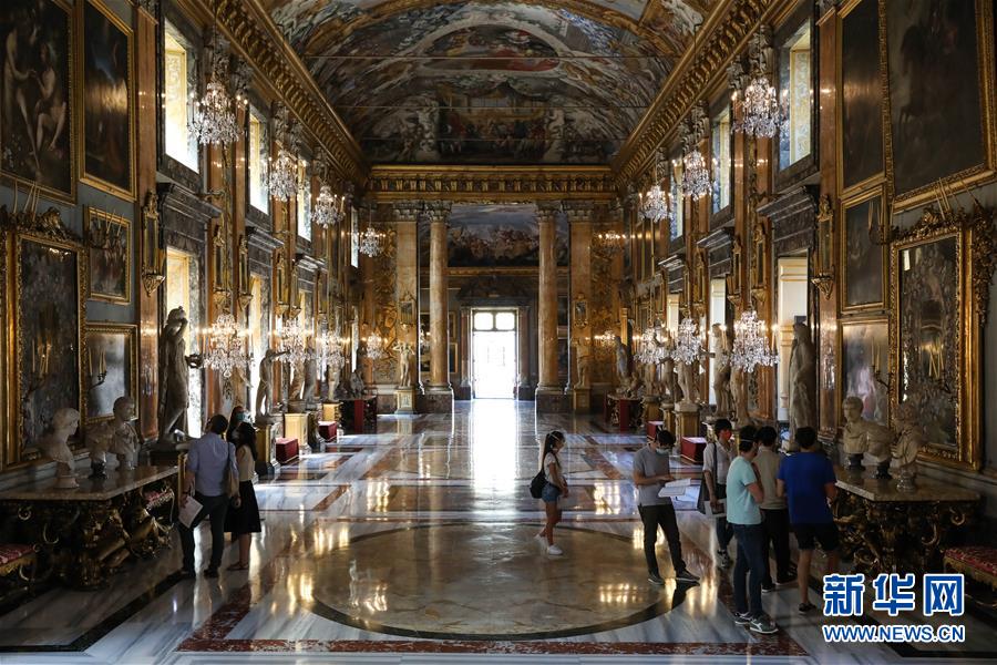 5月23日,在意大利首都罗马,人们戴着口罩在科隆纳宫参观。新华社记者程婷婷摄