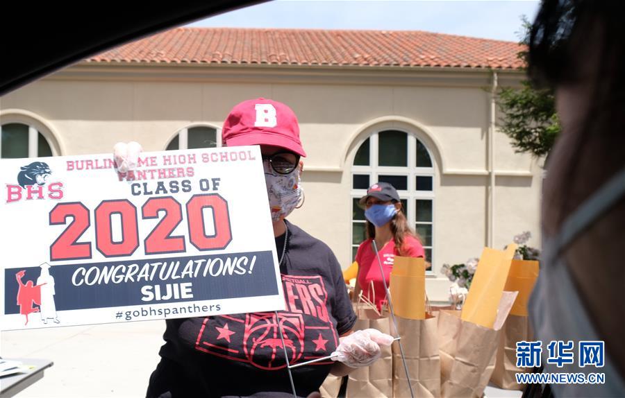 5月22日,在美国加州北部圣马特奥县,工作人员欢迎来办理毕业手续的学生。新华社记者 吴晓凌 摄