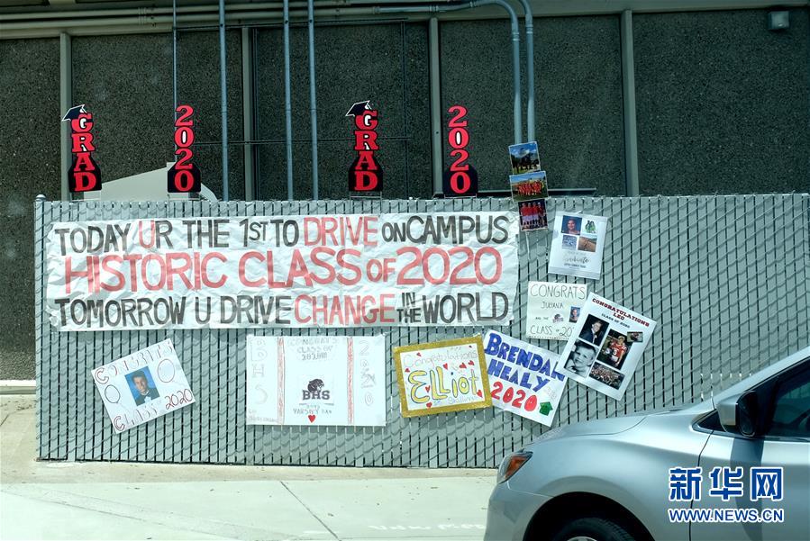 这是5月22日在美国加州北部圣马特奥县伯灵格姆高中拍摄的欢迎毕业生的海报。新华社记者 吴晓凌 摄