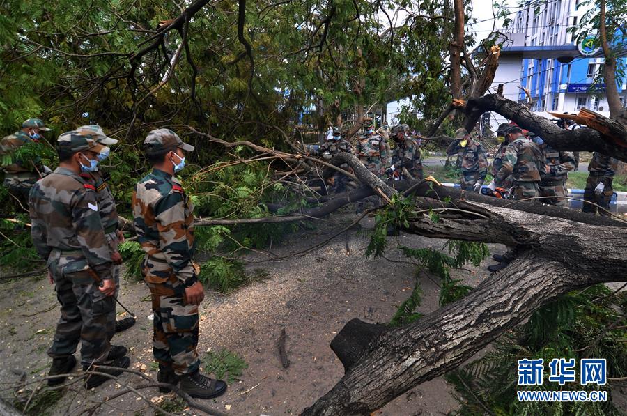 5月24日,在印度加尔各答,军事人员清理一处倒下的树木。 特强气旋风暴“安攀”本周早些时候重创印度西孟加拉邦,政府正在组织灾区清理,以恢复正常生活。 新华社发