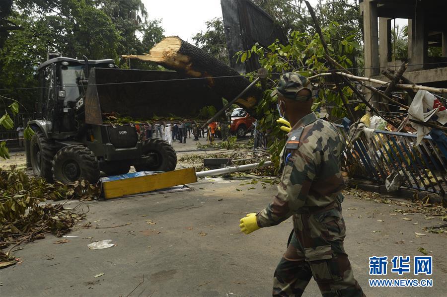 5月24日,在印度加尔各答,军事人员清理一处倒下的树木。 特强气旋风暴“安攀”本周早些时候重创印度西孟加拉邦,政府正在组织灾区清理,以恢复正常生活。 新华社发