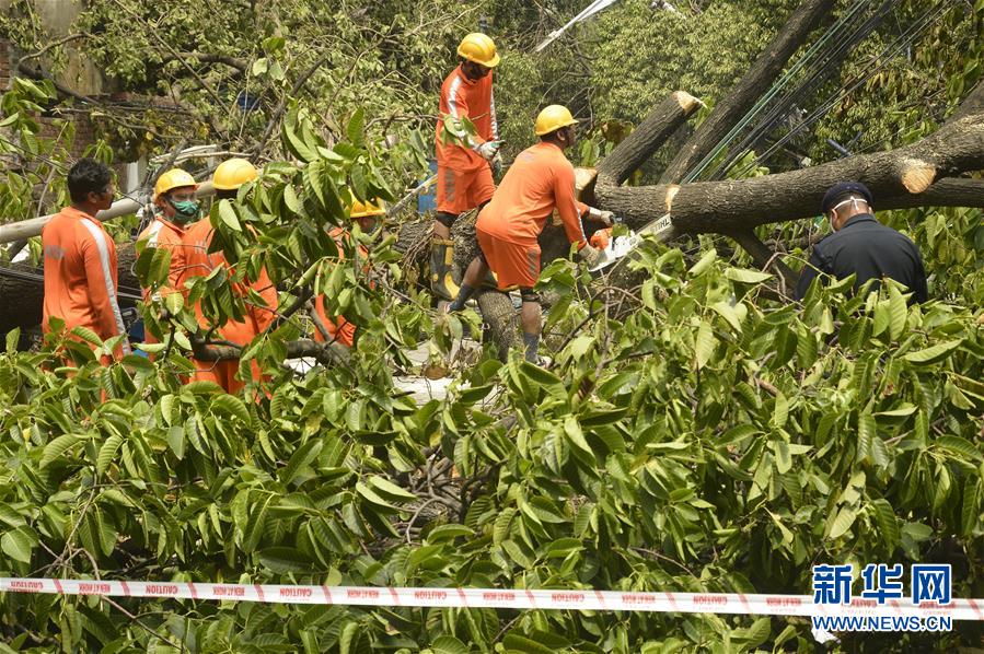 5月24日,在印度加尔各答,应灾部门人员清理一处倒下的树木。 特强气旋风暴“安攀”本周早些时候重创印度西孟加拉邦,政府正在组织灾区清理,以恢复正常生活。 新华社发