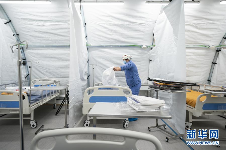5月24日,医护人员在智利首都大区新落成的专门收治新冠患者的方舱医院内忙碌。 智利总统皮涅拉24日视察了首都大区新落成的首个专门收治新冠患者的方舱医院。智利拟搭建5个类似的方舱医院,总共可提供床位500张。 新华社发(智利总统府供图)