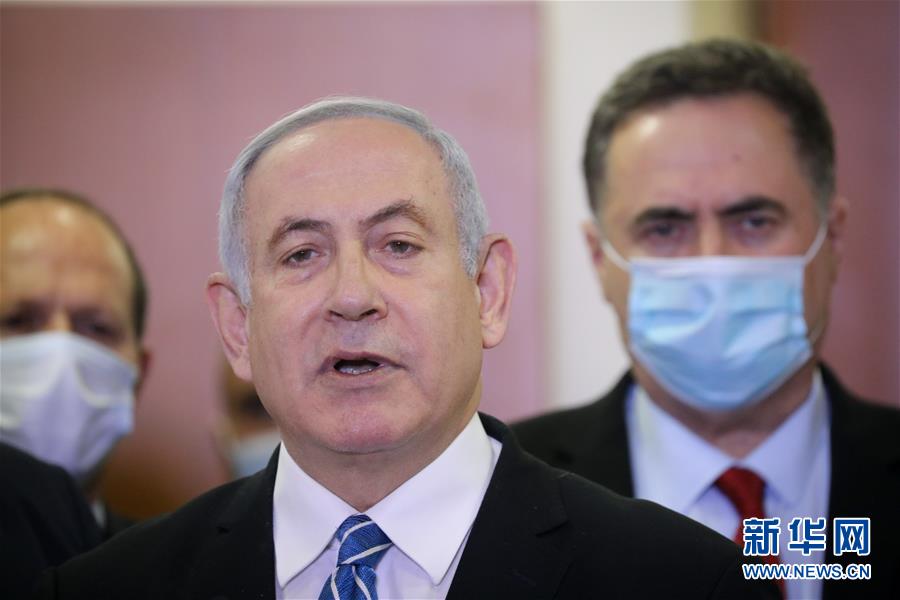 5月24日,以色列总理内塔尼亚胡(中)在进入耶路撒冷地方法院前发表声明。 耶路撒冷地方法院24日开庭审理以色列总理内塔尼亚胡涉嫌贪腐案,审判小组由三名法官组成,内塔尼亚胡由此成为以色列首位接受司法审理的在任总理。 新华社/基尼图片社