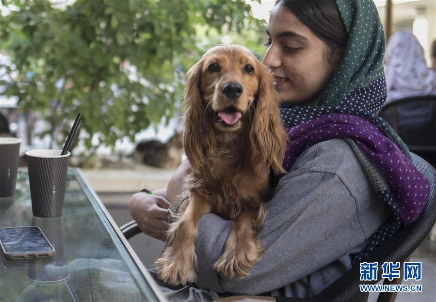 5月26日,在伊朗德黑兰一家咖啡馆内,一名女子抱着她的狗。 伊朗的餐馆和咖啡馆从5月26日开始恢复营业。 新华社发(艾哈迈德·哈拉比萨斯摄)