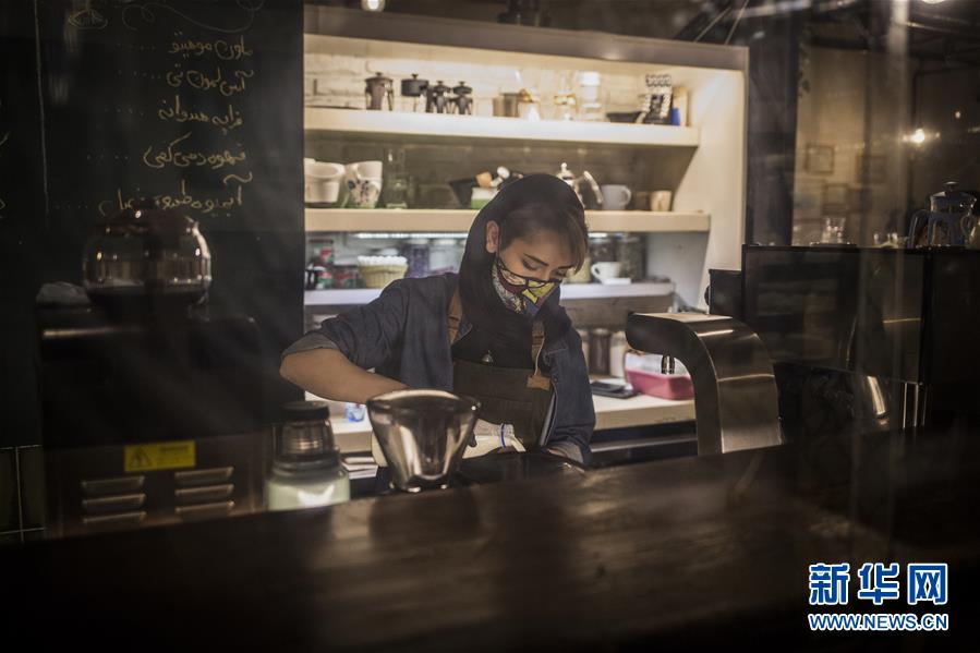 5月26日,伊朗德黑兰一家咖啡馆的工作人员戴着口罩工作。 伊朗的餐馆和咖啡馆从5月26日开始恢复营业。 新华社发(艾哈迈德·哈拉比萨斯摄)