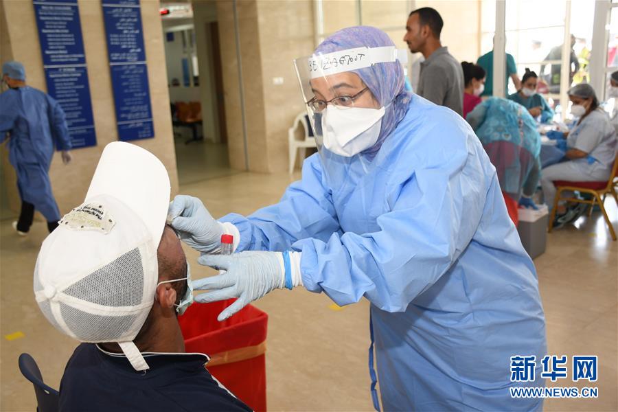 5月27日,在摩洛哥萨尔,一名医务工作者为一名出租车司机进行新冠病毒检测。 摩洛哥卫生部27日报告新增24例新冠确诊病例,该国累计确诊病例达7601例。 新华社发(查迪摄)