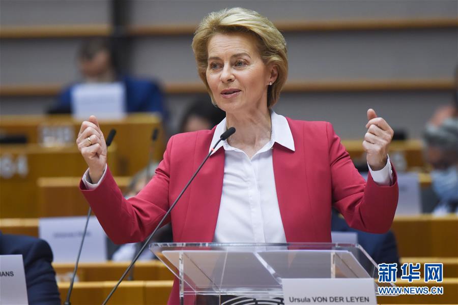 5月27日,在比利时布鲁塞尔的欧盟总部,欧盟委员会主席冯德莱恩在欧洲议会全会上发言。 欧盟委员会27日提议通过发债方式筹集资金以设立总额为7500亿欧元的“恢复基金”,用于帮助欧盟成员国在新冠疫情后重建经济。 新华社发(欧盟供图)