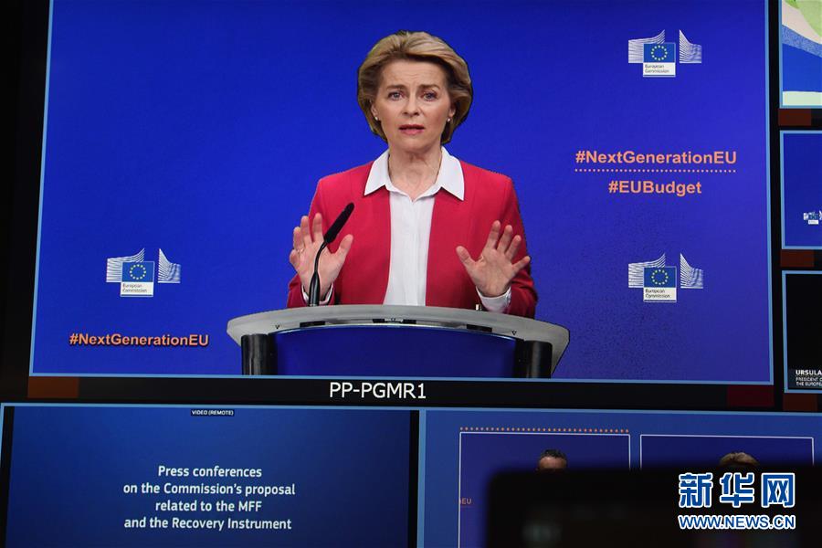 5月27日,在比利时布鲁塞尔的欧盟总部,欧盟委员会主席冯德莱恩在欧洲议会全会后出席线上新闻发布会。 欧盟委员会27日提议通过发债方式筹集资金以设立总额为7500亿欧元的“恢复基金”,用于帮助欧盟成员国在新冠疫情后重建经济。 新华社发(欧盟供图)