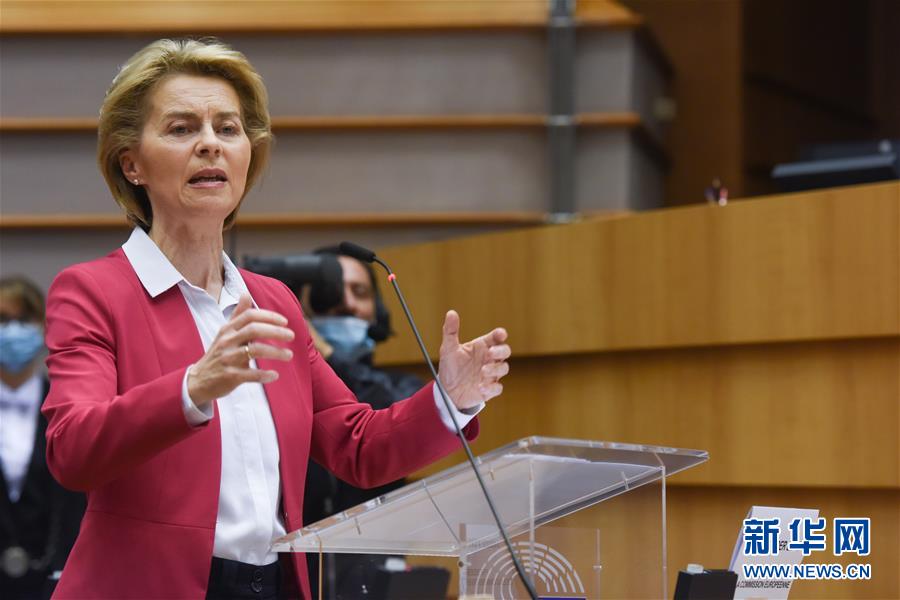 5月27日,在比利时布鲁塞尔的欧盟总部,欧盟委员会主席冯德莱恩在欧洲议会全会上发言。 欧盟委员会27日提议通过发债方式筹集资金以设立总额为7500亿欧元的“恢复基金”,用于帮助欧盟成员国在新冠疫情后重建经济。 新华社发(欧盟供图)