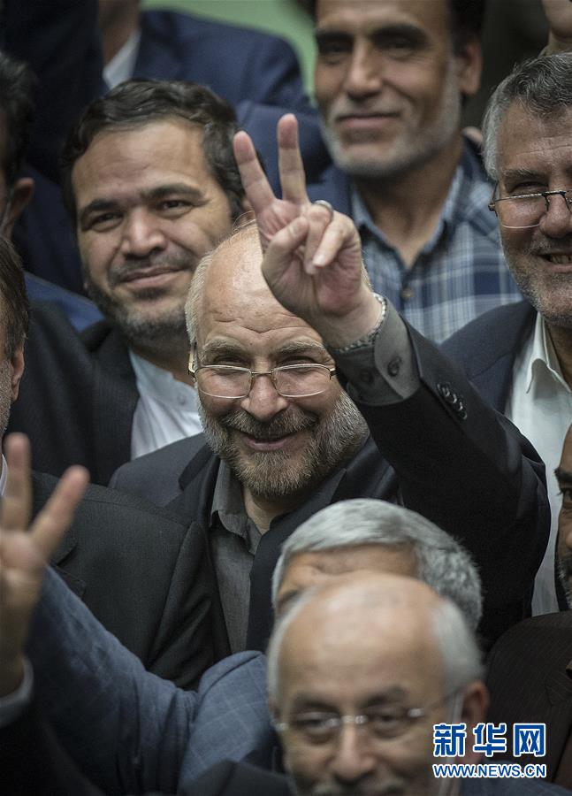 5月28日,在伊朗首都德黑兰,新一届伊朗伊斯兰议会议长卡利巴夫(中)做出“胜利”的手势。 新一届伊朗伊斯兰议会28日选举前伊斯兰革命卫队空军司令、前德黑兰市长穆罕默德·巴吉尔·卡利巴夫为议长。伊朗伊斯兰议会设有290个席位,任期通常为四年。 新华社发(艾哈迈德·哈拉比萨斯摄)