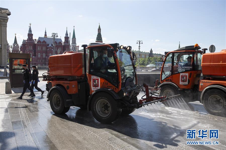 5月28日,在俄罗斯首都莫斯科市中心,市政车辆进行消毒作业。新华社发(亚历山大摄)