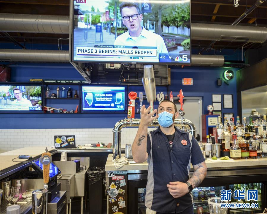 5月29日,调酒师在美国芝加哥北郊的一家酒吧内调制鸡尾酒。 当日,美国伊利诺伊州结束实施了两个多月的“居家令”。 新华社发(乔治·普弗尔特纳摄)