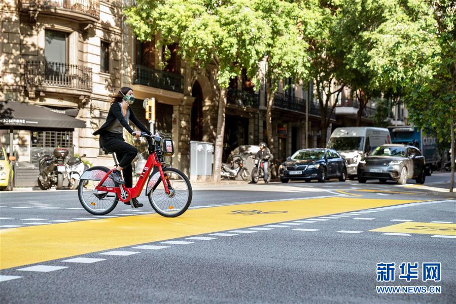 5月29日,在西班牙巴塞罗那,一名女子戴着口罩骑行。 西班牙巴塞罗那将于6月8日进入“解封”第二阶段。 新华社发(巴塞罗那市政厅供图)
