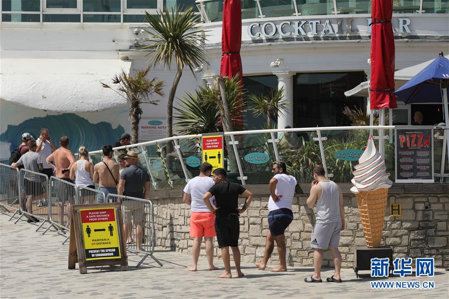 5月30日,在英国伯恩茅斯的一处海滩,人们在一个酒吧门口排队。 英国首相约翰逊28日宣布,从6月1日开始英国部分地区学校开始逐步复课、“非必需”零售业经营也会陆续恢复,人们也将被允许在户外小范围聚会。 新华社发(蒂姆·爱尔兰摄)