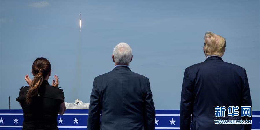 5月30日,在美国佛罗里达州肯尼迪航天中心,美国总统特朗普(右)和美国副总统彭斯(中)等观看载人版“龙”飞船搭乘“猎鹰9”火箭升空。 美国太空探索技术公司的“龙”飞船30日首次进行载人试飞。这是自2011年以来美国首次使用国产火箭从本土将宇航员送往国际空间站。 新华社发(美国国家航空航天局供图)