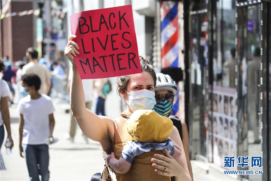 5月30日,在美国纽约昆斯区,一名女子高举标语抗议警方暴力执法。 由美国明尼苏达州明尼阿波利斯市警察执法失当致非裔男子乔治·弗洛伊德死亡一事在当地引发的抗议活动30日蔓延至美国多地。 新华社记者 王迎 摄