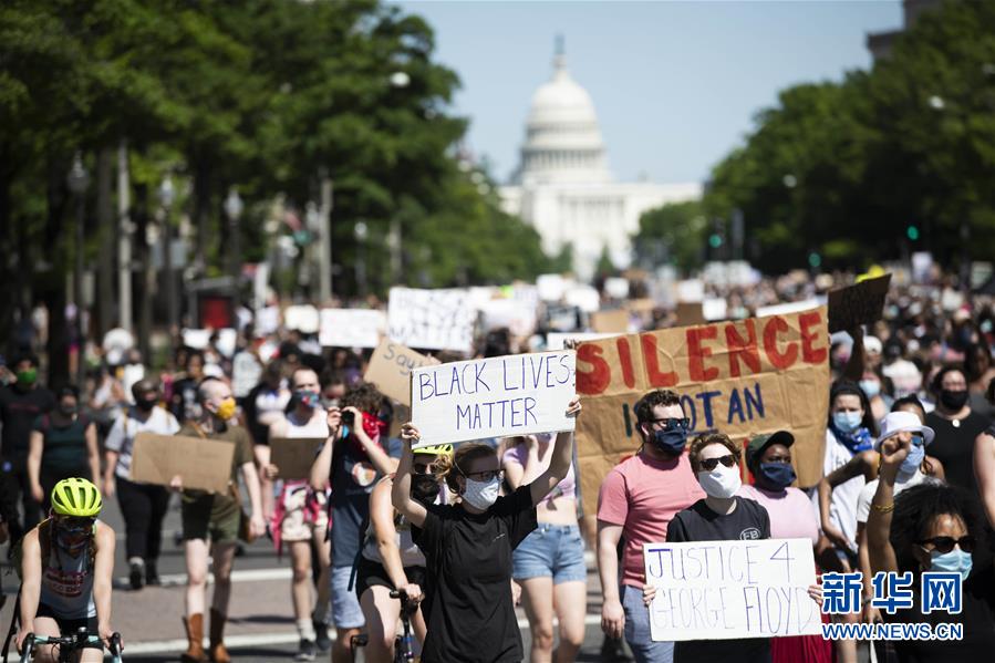 5月30日,在美国首都华盛顿国会山附近,人们手持标语参加抗议活动。 新华社记者 刘杰 摄