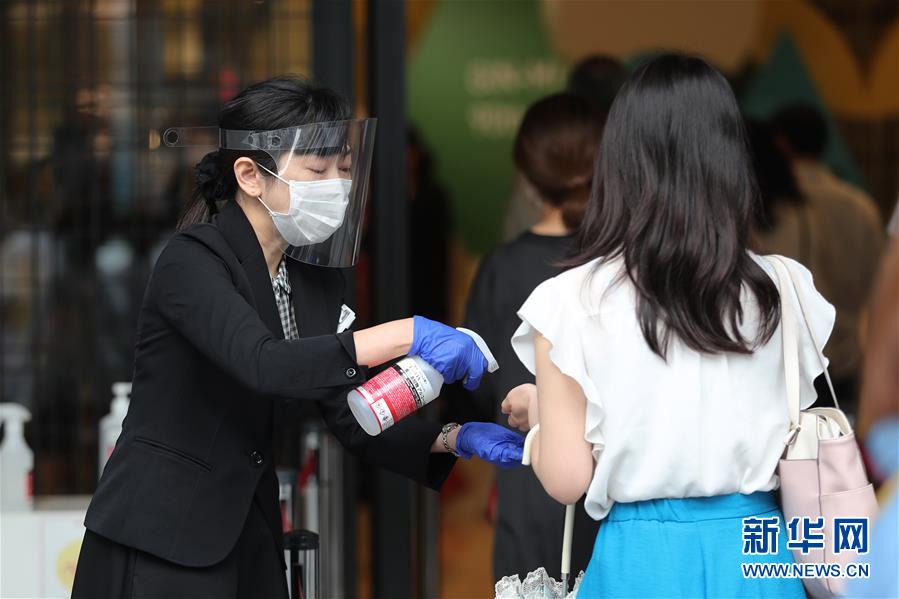 5月30日,在日本东京,银座一间百货商店的工作人员(左)为顾客进行手部消毒。 当日是日本东京解除紧急状态后首个周六,各商圈人流量明显增多。日本首相安倍晋三5月25日晚宣布,日本全国解除紧急状态。此前日本47个都道府县中已仅剩东京都、北海道等5地维持紧急状态。 新华社记者 杜潇逸 摄