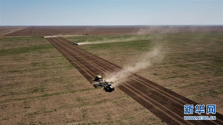 5月30日,在哈萨克斯坦阿克莫拉州阿克莫尔村,农民进行小麦春播作业(无人机照片)。 近日,哈萨克斯坦各地进入春耕时节。 新华社发(奥斯潘诺夫摄)