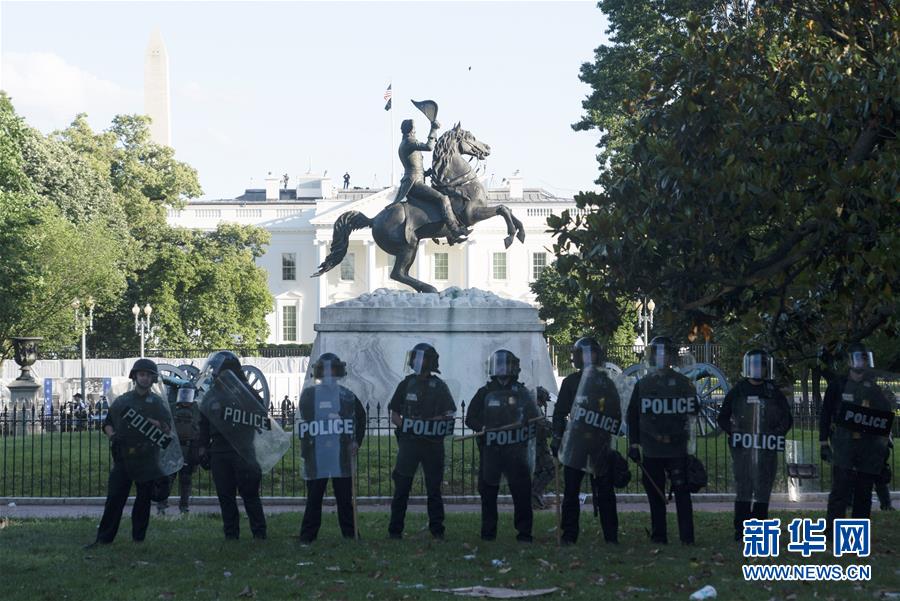 5月31日,在美国首都华盛顿,警察列队警戒。 由美国明尼苏达州白人警察执法致非洲裔男子死亡事件引发的抗议和骚乱5月31日仍在美国多地持续。31日,美国首都华盛顿民众走上街头抗议警察暴力执法和种族主义。 新华社记者 刘杰 摄