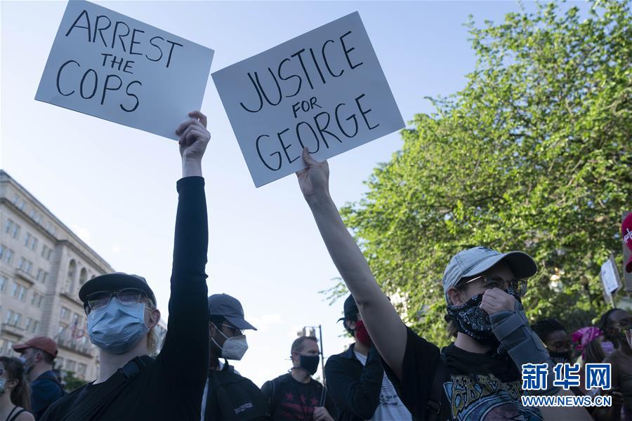 5月31日,在美国首都华盛顿,人们手举标语在白宫前参加抗议。 由美国明尼苏达州白人警察执法致非洲裔男子死亡事件引发的抗议和骚乱5月31日仍在美国多地持续。31日,美国首都华盛顿民众走上街头抗议警察暴力执法和种族主义。 新华社记者 刘杰 摄