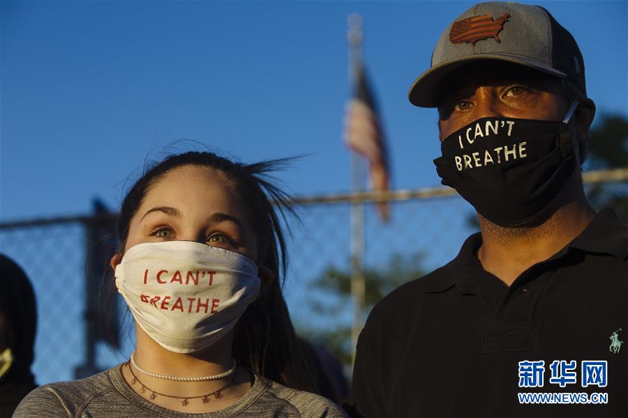 5月30日晚,在美国明尼苏达州明尼阿波利斯市,抗议者面戴写有“我无法呼吸”的口罩,参加抗议活动。
