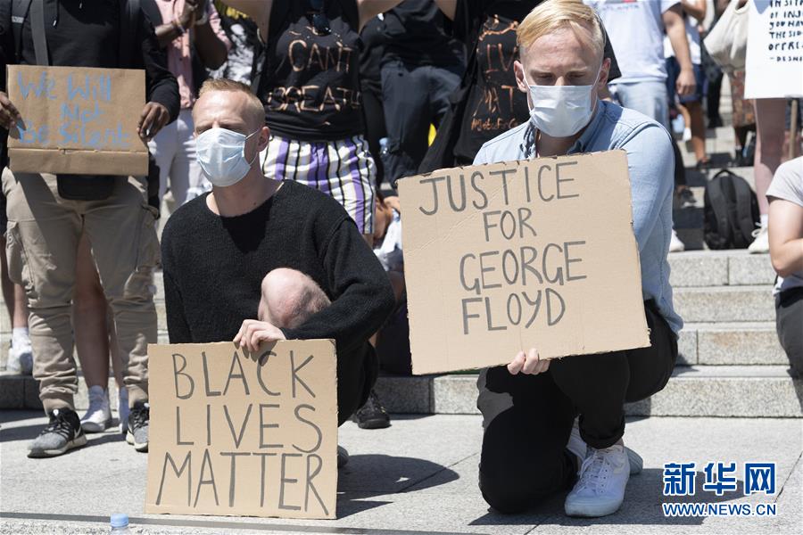 5月31日,人们手持标语在英国伦敦参加抗议活动。 当日,英国伦敦举行示威活动,抗议美国明尼阿波利斯市警察执法失当致非裔男子乔治·弗洛伊德死亡。 新华社发
