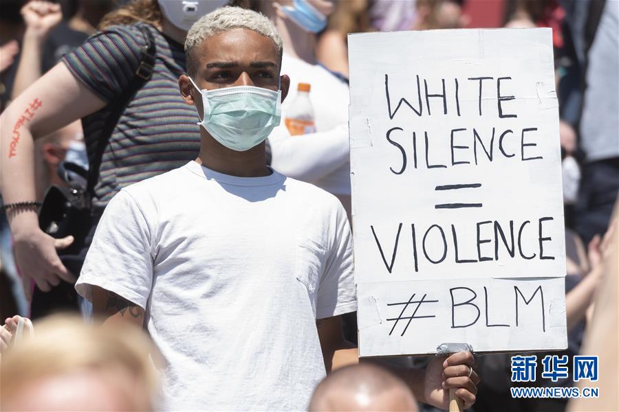 5月31日,抗议者手持标语在英国伦敦特拉法尔加广场参加抗议活动。 当日,英国伦敦举行示威活动,抗议美国明尼阿波利斯市警察执法失当致非裔男子乔治·弗洛伊德死亡。 新华社发