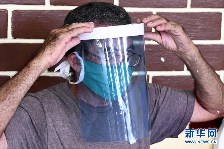 5月27日,在古巴首都哈瓦那郊外,鲁文·鲁伊斯在家中试戴自己用再生材料制作的医用面罩。 新华社发(华金·埃尔南德斯摄)