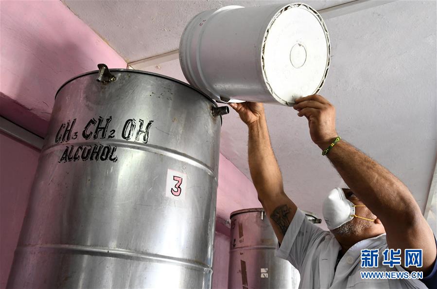 3月26日,在古巴哈瓦那酿酒厂,一名工人给生产抗菌洗手凝胶的设备加注酒精。 新华社发(华金·埃尔南德斯摄)