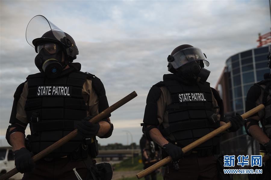 5月31日,在美国明尼苏达州明尼阿波利斯市,手握警棍的警察在街头警戒。 新华社发(安格斯·亚历山大摄)