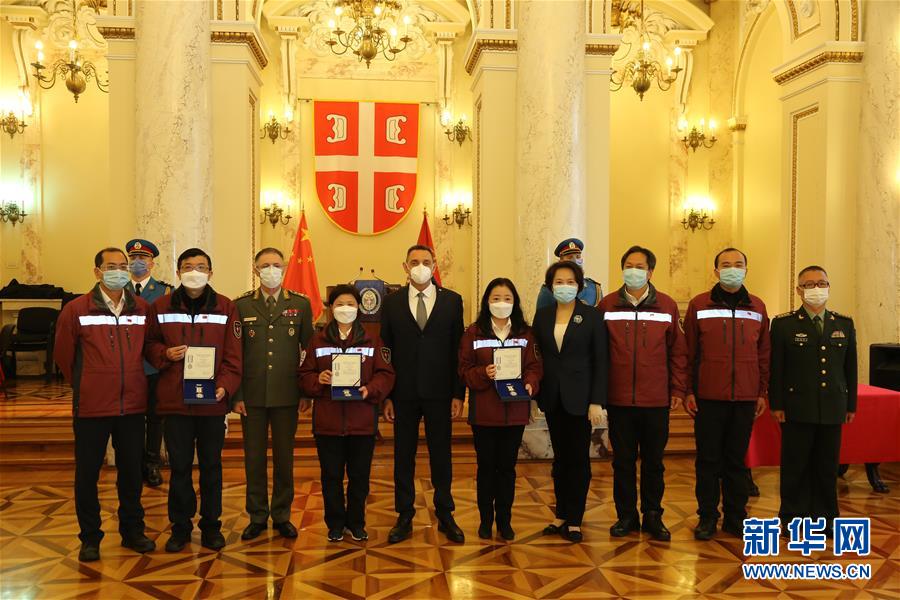 6月1日,在塞尔维亚首都贝尔格莱德,塞尔维亚国防部长武林(左五)、中国驻塞尔维亚大使陈波(右四)在授勋仪式上和中国赴塞抗疫医疗专家组成员等合影。 新华社记者 石中玉 摄