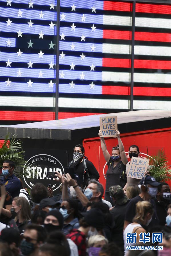 6月1日,民众在美国纽约时报广场抗议警察暴力执法。 美国明尼苏达州白人警察暴力执法导致非洲裔男子乔治·弗洛伊德死亡,由此引发的抗议示威活动连日来在全美持续蔓延。在纽约市,抗议活动已持续5天。 新华社记者 王迎 摄
