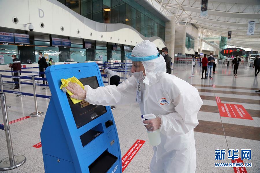 6月1日,在土耳其安卡拉的埃森博阿机场,工作人员为自助值机设备消毒。当日,土耳其恢复部分国内航班。 新华社发(穆斯塔法·卡亚摄)