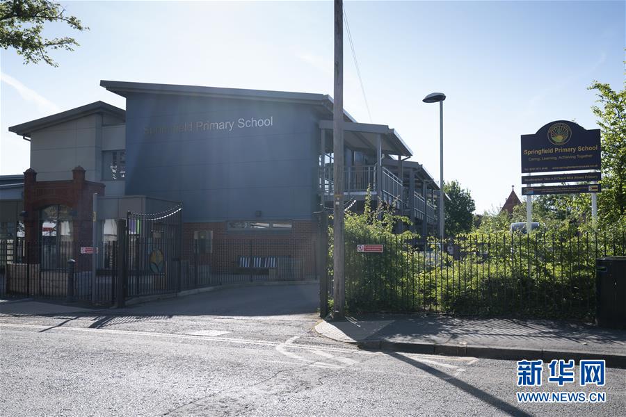这是6月1日在英国曼彻斯特拍摄的一所复课的小学。 按照英国政府的逐步“解封”计划,从6月1日开始,英格兰的幼儿园、学前班、小学一年级和六年级优先恢复上课。 新华社发(乔恩·休珀摄)