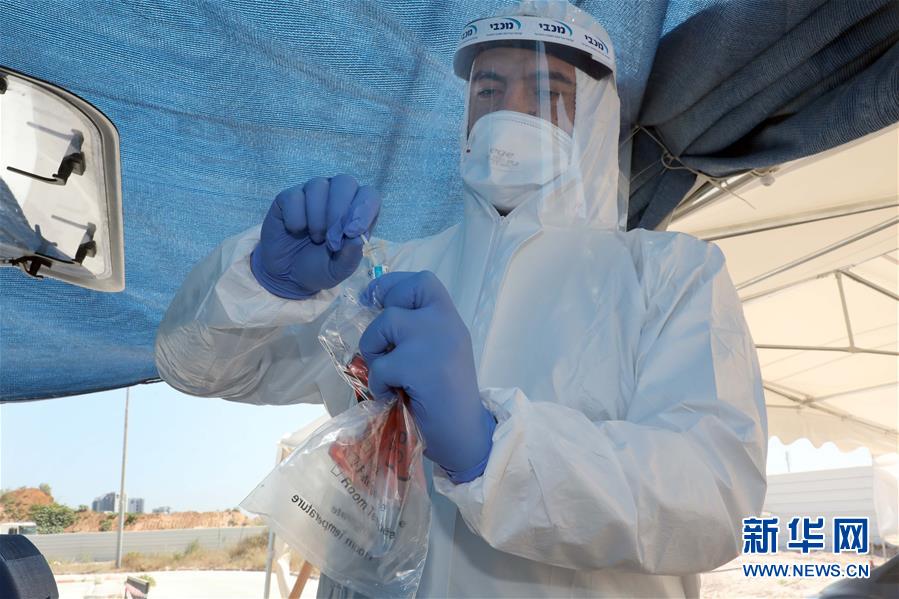 6月1日,在以色列中部城市特拉维夫,身着防护装备的医务人员在一处新冠病毒检测站工作。 以色列卫生部长尤利·埃德尔斯坦5月31日宣布,以色列将大幅扩大新冠病毒的检测范围,包括未出现新冠病毒症状的人员。 新华社/基尼图片社