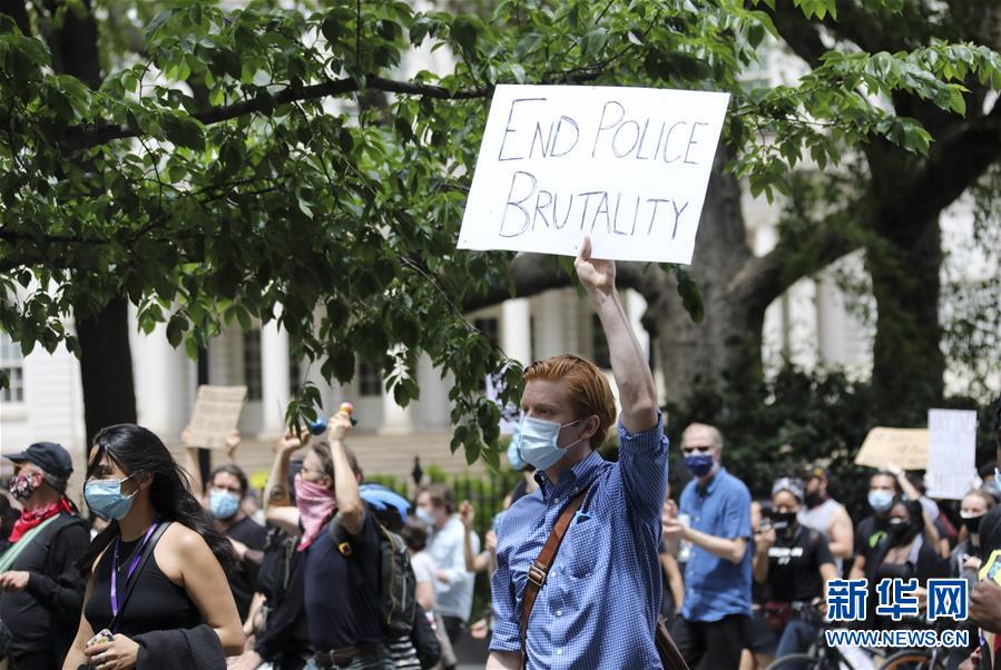 6月2日,民众在美国纽约街头抗议警察暴力执法。 当天,由美国明尼苏达州明尼阿波利斯市警察执法失当致非裔男子乔治·弗洛伊德死亡一事引发的抗议活动在纽约进入第六天,数千民众继续在街头抗议。同时,纽约市宣布将宵禁延长至周日,于每晚8时至次日凌晨5时实施。 新华社记者 王迎 摄