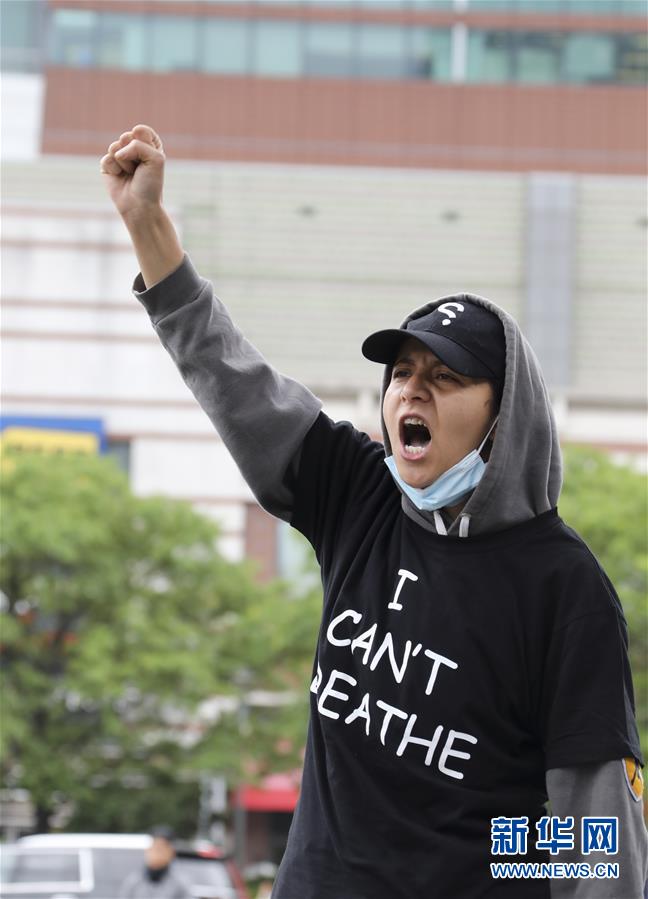6月2日,一名示威者在美国纽约街头抗议警察暴力执法。 当天,由美国明尼苏达州明尼阿波利斯市警察执法失当致非裔男子乔治·弗洛伊德死亡一事引发的抗议活动在纽约进入第六天,数千民众继续在街头抗议。同时,纽约市宣布将宵禁延长至周日,于每晚8时至次日凌晨5时实施。 新华社记者 王迎 摄
