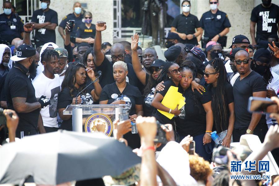 6月2日,乔治·弗洛伊德的家人(中)在美国休斯敦参加纪念游行。 蔓延美国的抗议警察暴力执法活动2日进入第八天。在得克萨斯州休斯敦,上万民众当天下午为日前遭警察暴力执法死亡的非洲裔男子乔治·弗洛伊德举行纪念游行。 新华社发(劳承跃摄)