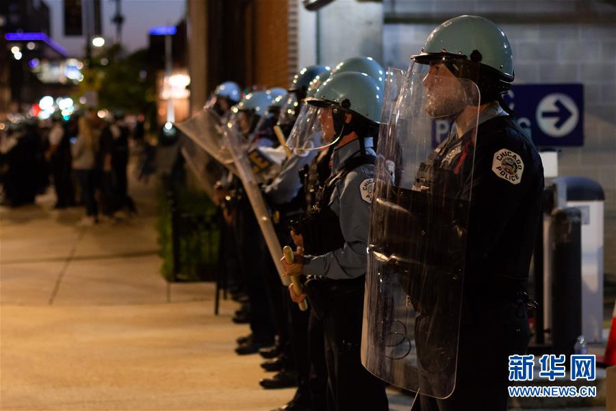 6月1日,在美国芝加哥北城,警察列队值勤。 非裔男子乔治·弗洛伊德之死引发的抗议示威活动连日来在美国持续蔓延。 新华社发(杰瓦杰·洛根摄)