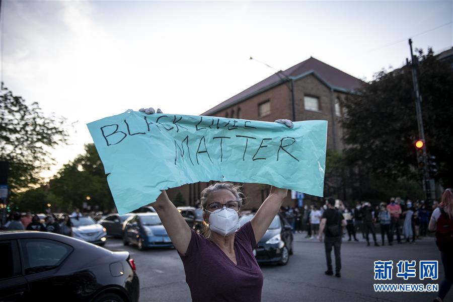 6月1日,在美国芝加哥北城,一名抗议者手举标语参加抗议示威活动。 非裔男子乔治·弗洛伊德之死引发的抗议示威活动连日来在美国持续蔓延。 新华社发(克里斯·迪尔茨摄)