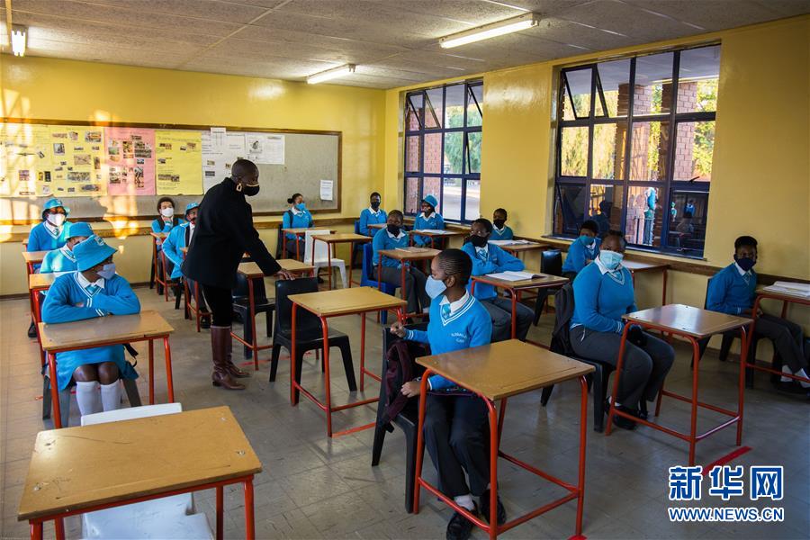 6月2日,在博茨瓦纳首都哈博罗内的一所学校的教室内,学生们在保持安全距离的情况下准备上课。新华社发(策基索·特巴洛摄)
