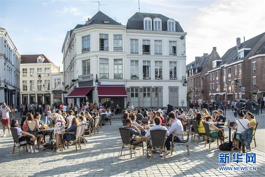 6月2日傍晚,人们在法国北部城市里尔一家酒吧的露天区域休闲。 法国自2日起进入解禁第二阶段。全国餐馆、咖啡馆、酒吧等恢复营业,多数初中和高中复课,居民出行离家距离不得超过100公里的限制也被取消。 新华社发(塞巴斯蒂安·库尔吉摄)