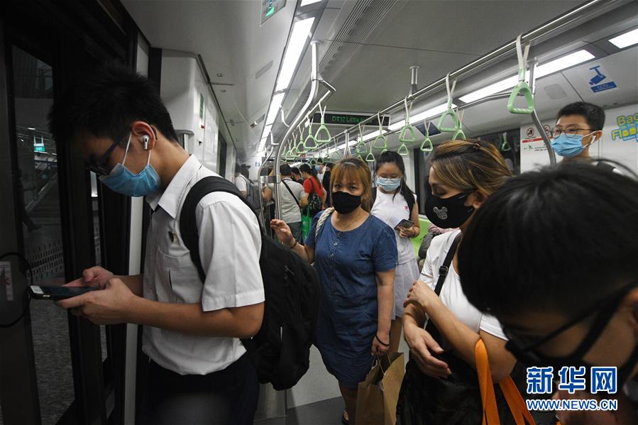6月3日,市民搭乘新加坡滨海市区线地铁。 新加坡实施的防止新冠疫情蔓延的“阻断措施”6月1日到期,政府从6月2日起分三个阶段逐步放宽限制。 新华社发(邓智炜摄)