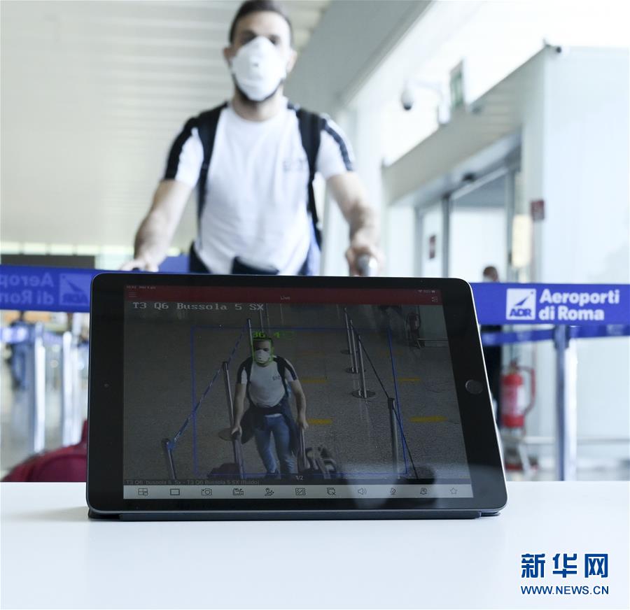 6月3日,在意大利首都罗马的菲乌米奇诺机场,工作人员监测旅客体温。 自6月2日起,意大利与欧美国家的航线逐渐恢复;从6月3日开始,民众可以跨地区自由出行。 新华社发(阿尔贝托·林格利亚摄)