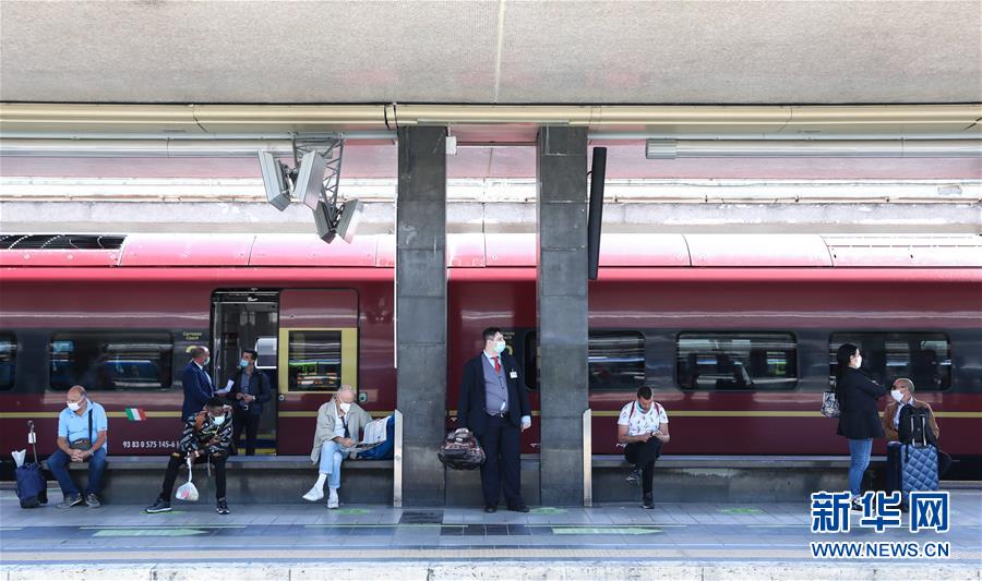 6月3日,在意大利首都罗马特米尼火车站,乘客戴着口罩在站台候车。 新华社记者 程婷婷 摄