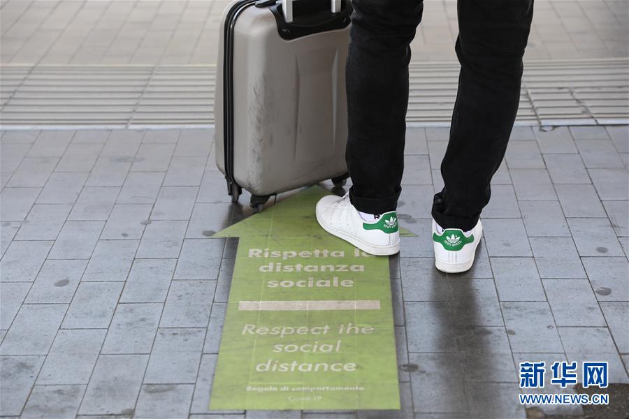 6月3日,在意大利首都罗马特米尼火车站,地面上贴着提醒人们保持社交距离的标识。 新华社记者 程婷婷 摄