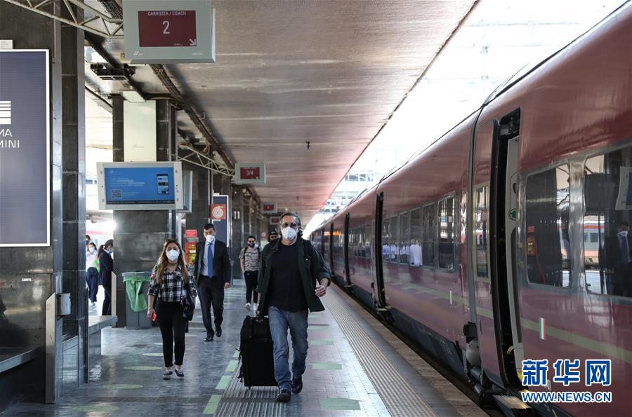 6月3日,在意大利首都罗马特米尼火车站,乘客戴着口罩出行。 新华社记者 程婷婷 摄
